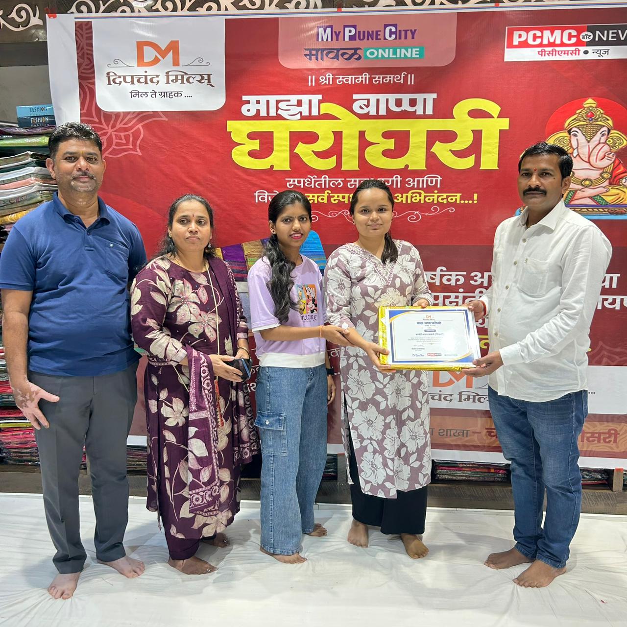 Team My Pune City – गणेशोत्सवानिमित्त ‘माय पुणे सिटी न्यूज’, ‘मावळ ऑनलाइन न्यूज’ व ‘पीसीएमसी न्यूज’च्या वतीने घेण्यात ( Maza Bappa Gharoghari) आलेल्या ‘माझा बाप्पा घरोघरी’ स्पर्धेचा पहिल्या टप्प्यातील पारितोषिक वितरण समारंभ रविवारी (ता. २१) भोसरी येथील दिपचंद मिल्सच्या दालनामध्ये झाला. स्पर्धेचे सहप्रायोजक असलेले दिपचंद मिल्स यांच्याकडून नारायण पेठ साडी बक्षीस देण्यात आली.